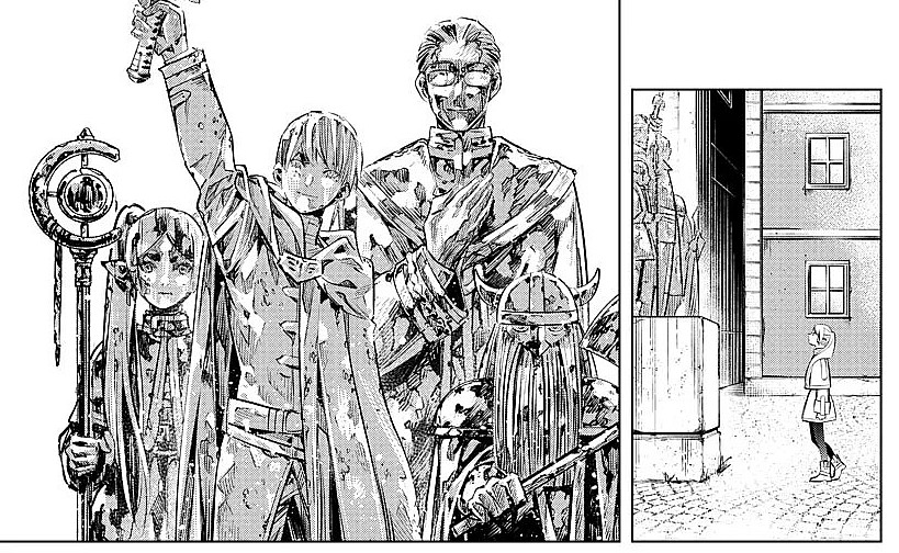 여행을 떠난 지 50년 만에 힘멜에게 맡겨두었던 암흑룡의 뿔을 떠올며 다시 왕도를 찾는다. 세월의 흐름을 정통으로? 맞은 힘멜의 변모에 당혹해 한다. 바뀐 거리의 풍경과 자신들의 조각상을 바라보며 세월의 흐름을 인식한다.