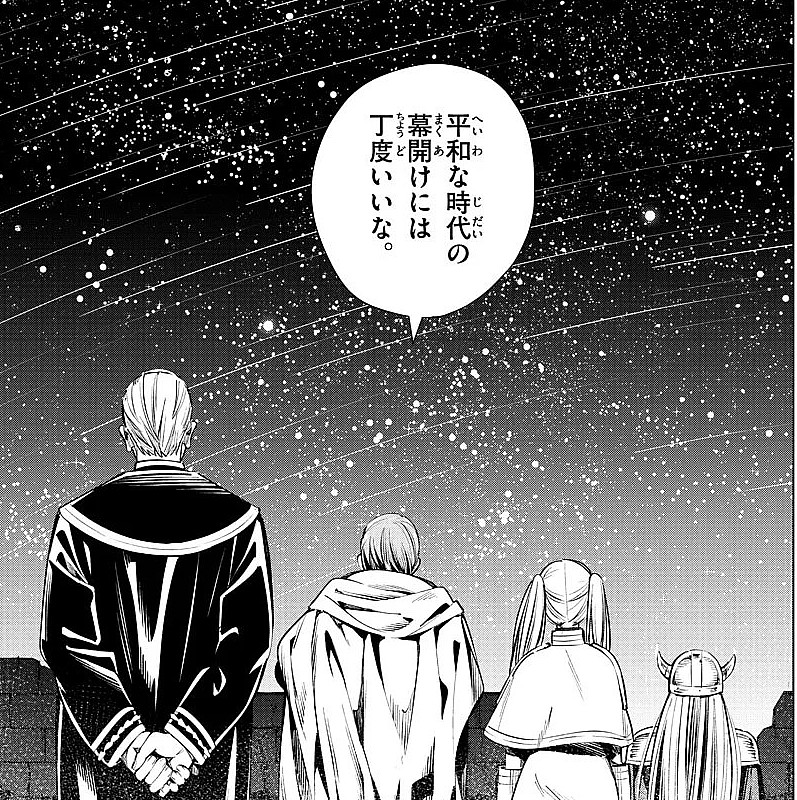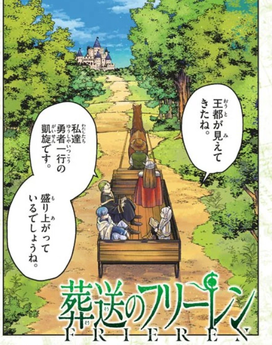 사람들의 축하 속에 입성한 그들은 왕과의 알현을 마치고 축제에서 잔을 나누며 지난 추억을 회상한다. 마치 이들의 승리와 평화로운 시대의 막을 알리기라도 하듯이 50년 주기로 찾아온다는 유성우를 바라보던 프리렌은 50년 뒤를 더 멋진 유성우를 볼 수 있는 곳을 안내하겠다는 약속을 한다. 뭔가 할 말이 있는 듯한 힘멜은 말 끝을 흐린다. 다음 날 다른 동료의 배웅을 받으면 프리렌은 엘프다운 시간 감각으로 100년 정도 마법을 수집하는 여행을 할 것이며, 가끔 찾아오겠다는 말을 남기고 떠난다.